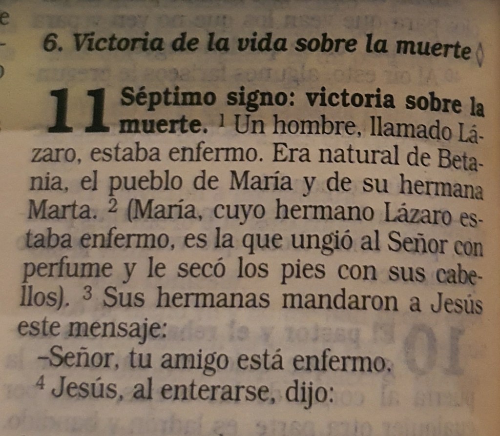 En muchas biblias, podemos ver que se habla del séptimo signo Juan en su evangelio usa la simbología de una nueva creación, donde pone 7 simbolos: 18:00 1.- La boda de Caná (Jn 2, 1-11) 2.- Curación del hijo del funcionario del rey (Jn 4, 43-54) 3.- Curación del Paralitico (Jn 5, 1-9) 4.- Multiplicación de los panes (Jn 6, 1-15) 5.- Jesús camina sobre las aguas (Jn 6, 16-21) 6.- El ciego de nacimiento (Jn 9, 1-41) 7.- Resurrección de Lázaro (Jn 11, 1-44)