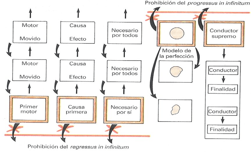 - Este pensamiento es aplicado por santo Tomás a la primera vía (del movimiento), a la segunda (producción causal), a la cuarta (grados de perfección) y a la quinta (finalidad).