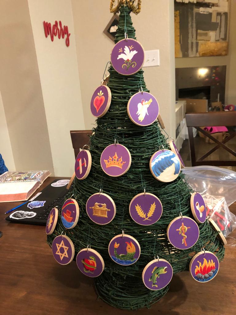 Cada día de Adviento, medita en un símbolo, o busca las imágenes y colócalas en una rama del árbol, comenzando desde la esquina izquierda de la rama más baja y moviéndose hacia la derecha. Cuando la rama esté llena, sube a la siguiente rama más alta.
