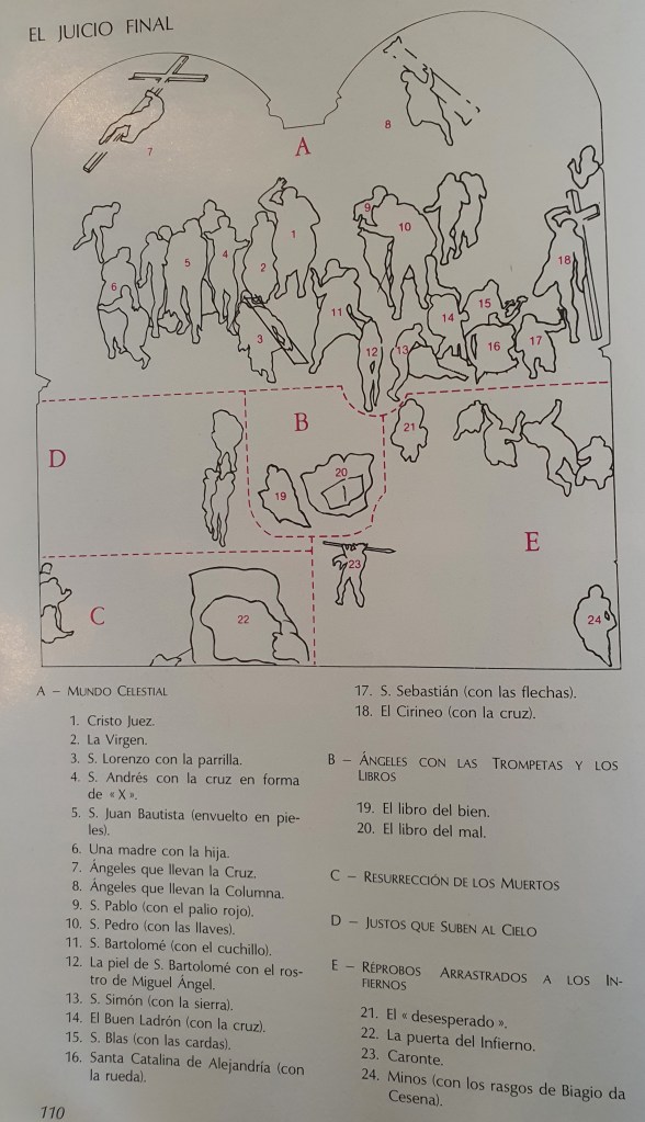 Miguel Ángel pintó el Apocalipsis de San Juan en el lugar de honor de la capilla, y lo hizo con un protagonista claro: ese Jesucristo excesivamente musculado es el centro compositivo y receptor de todas las miradas, con la Virgen a su lado. Cristo está separando a los justos de los pecadores y es probablemente uno de los pocos ejemplos en la historia del arte de un Cristo rudo, casi molesto, está en un rol que pocos hemos visto, está en su rol de Juez.
